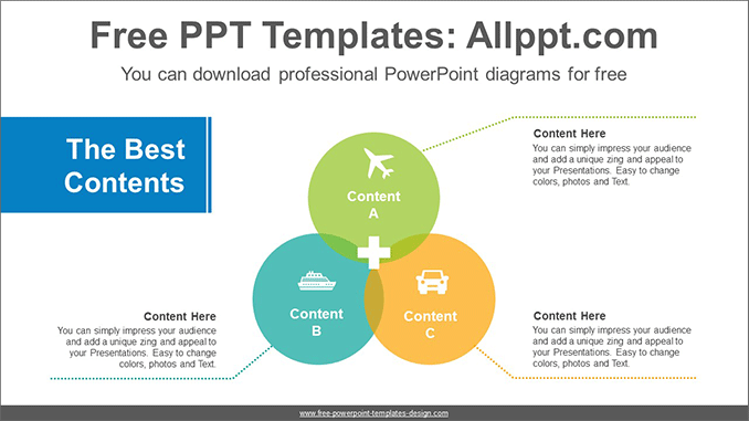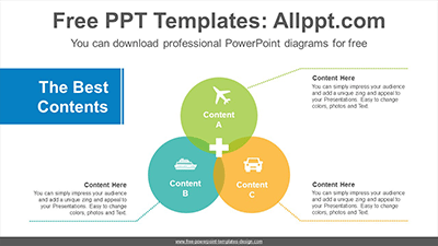 Intersection circle PowerPoint Diagram Template: This diagram represents intersection with three circles. Circles and text are linked in a variety of ways to visualize your data. Emphasize the interaction or relationship between groups of information. It is also an editable graphic with text and icon placeholders.